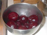 1. Trim all but about 1 1/2" of tops from the beets and wash. Boil them for about 30 minutes, or until tender. You can do this the day before and store them in the refrigerator to cool off. By leaving a little of the tops on the beets, they won't bleed as much.