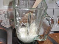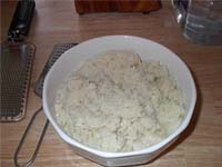 5. Place a little in a blender with a little of water to assist in the blending process. Blend at a fairly low speed until the horseradish is chopped fairly fine. Place in a bowl and continue until all of the horseradish is chopped up. If you don't have a blender, you could use a small grater. Just be sure you keep a window open and keep your face away from the bowl.